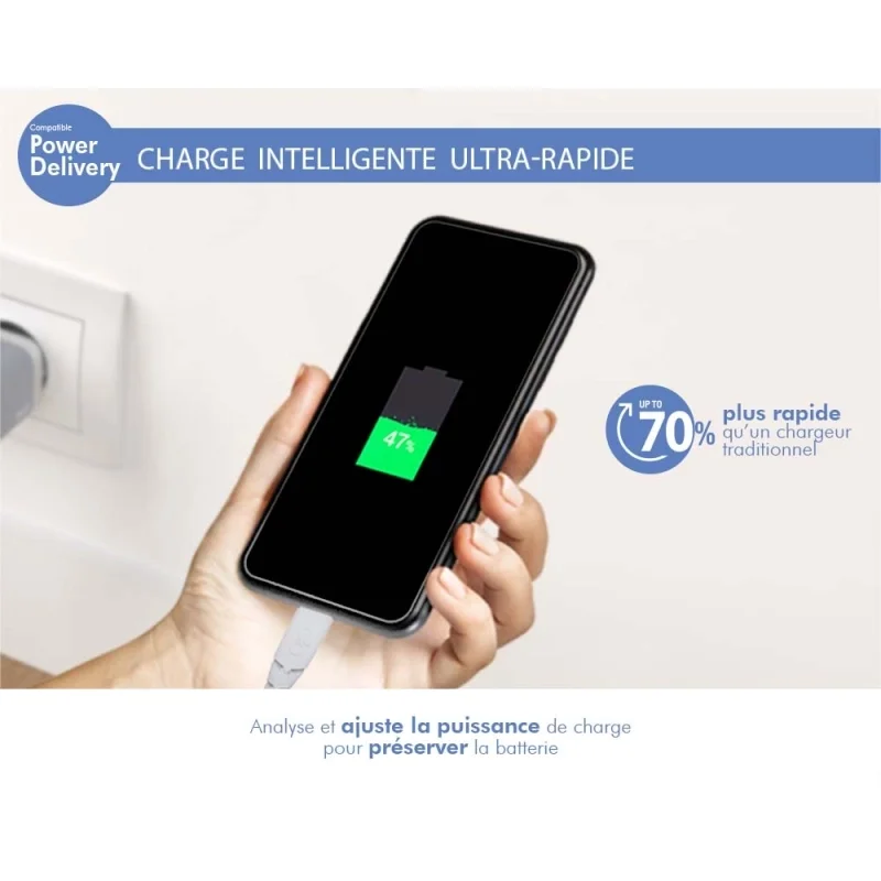 دیگر نیاز به داشتن چند شارژر نخواهید داشت: با این شارژر میتوانید تمامی  نیازهای خود را پوشش دهید. این شارژر گزینهای قدرتمند برای تامین انرژی  همه دستگاههای iOS (اپل) و اندروید (گوگل، سامسونگ، شیائومی، اوپو...)  محسوب میشود. کاربر میتواند شارژ صفر تا 50 درصد دستگاه پرچمدار خود را  در کمتر از 30 دقیقه انجام دهد. این شارژر به طور خودکار جریان مورد نیاز  برای شارژ سریع را تشخیص میدهد. همچنین، این فناوری جدید از خطر گرم شدن  بیش از حد جلوگیری میکند و عمر باتری را افزایش میدهد. به علاوه هنگامی  که باتری پر شد، منبع تغذیه خاموش می شود تا از فشار اضافه به باتری  جلوگیری کند.