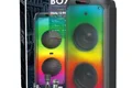 و با صدای موزیک هماهنگ هست قابلیت استفاده با برق مستقیم و باتری دارای پورت USB مموری AUX دو پورت میکروفن و یک پورت گیتارا قلام همراه دو میکروفون بیسیم و با سیم