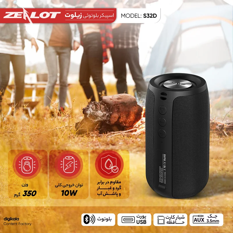 اسپیکر S32D از سری اسپیکر در کلاس جهانی میکروفون دار برند زیلوت است. این اسپیکر قابلیت اتصال میکروفون دارد تا علاوه بر گوش دادن به موزیک از قابلیت کارائوکه این محصول استفاده کنید.این اسپیکر دارای خروجی 5وات و توان ماکزیمم 10وات است. این قدرت توسط یک درایور اسپیکر با مگنت تقویت شده تشکیل شده تا صداهای زیر و بم موزیک به راحتی و بدون هیچ نویزی پخش شود.این اسپیکر دارای باطری داخلی 2200 میلی آمپر است که در استفاده همزمان موزیک و میکروفون مشکلی ندارد. بلوتوث به کار رفته در این اسپیکر از نوع ورژن 5 است و علاوه بر بلوتوث از TF CArd ، AUX،USB پشتیبانی می کند. پوشش به کار رفته در روی محصول در برابر گرد و غبار و پاشش آب مقاوم است و با توجه به وزن سبک این محصول، به راحتی میتوانید آن را همراه خود به ورزش، پیاده روی و طبیعگردی ببرید. در جعبهی اسپیکر یک بند وجود دارد که حمل آن را به مراتب آسانتر میکند.