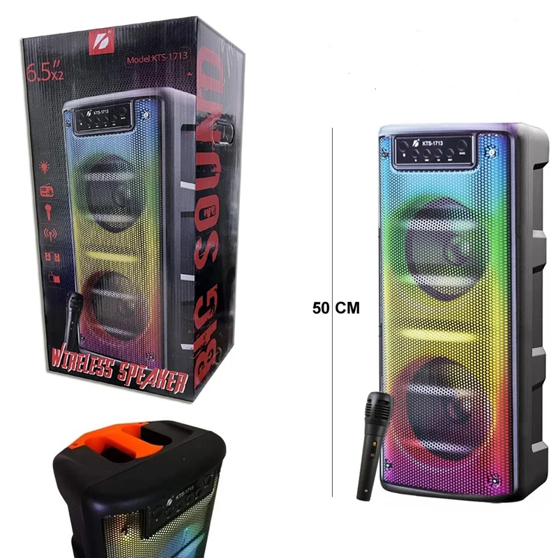 این اسپیکر شارژی 1713محصولی از شرکت kts است. این اسپیکر که به فناوری بلوتوث یا پخش کننده ی صوتی متصل می شود، می تواند صدایی با کیفیت خوب به کاربر ارائه دهد.
